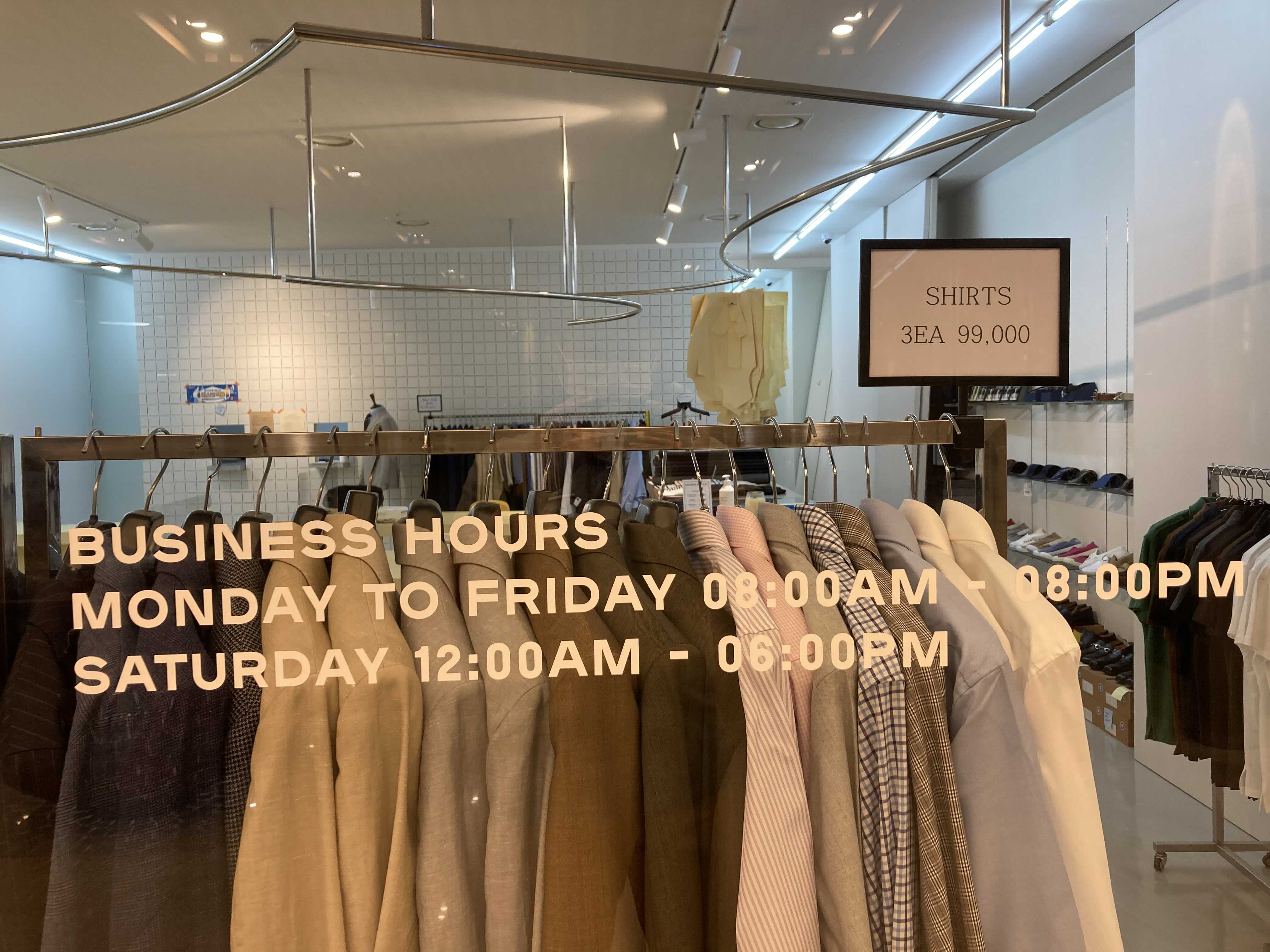 에스컬레이터를 타고 지하 2층으로 내려가면 바로 가게가 보입니다. 큰 간판은 없지만 옷이 전시되어 있는 것을 보면 바로 알 수 있습니다. 평일은 저녁 8시까지, 토요일은 저녁 6시까지 연다고 되어있습니다. 그래도 맞춤하러 가실 때는 한 번쯤 전화해 보고 가는 게 좋을 것 같습니다.