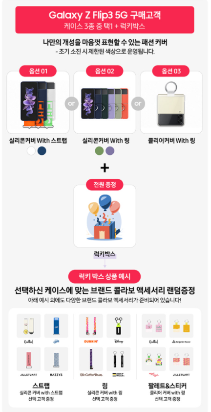 추가로, Flip3 구매고객에 대해서 럭키박스도 준다고 합니다. 럭키박스에는 스트랩, 링, 팔레트&스티커 등이 있으며 이중 1개를 랜덤으로 제공한다고 합니다.