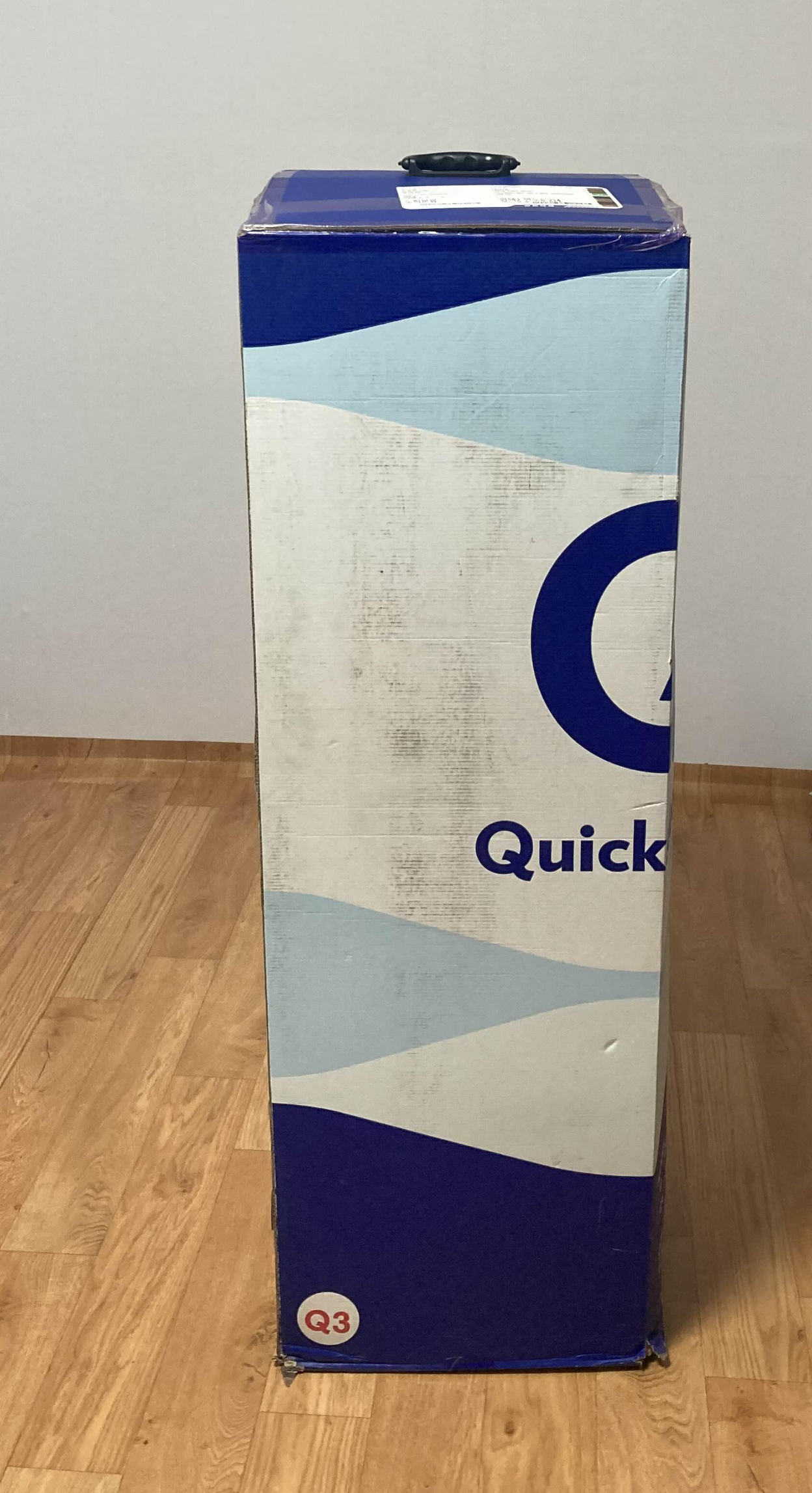 구매 후 2~3일 후 바로 문 앞에 배송이 왔습니다. 박스에 넣어진 상태로 끌고 다닐 수 있게 바퀴도 달려있어서 집 안으로 끌고 들어오기 매우 수월했습니다. 그렇게 집 안으로 갖고 들어와 봅니다. (상당히 무거우니 집에 들고 올 때 조심하세요)