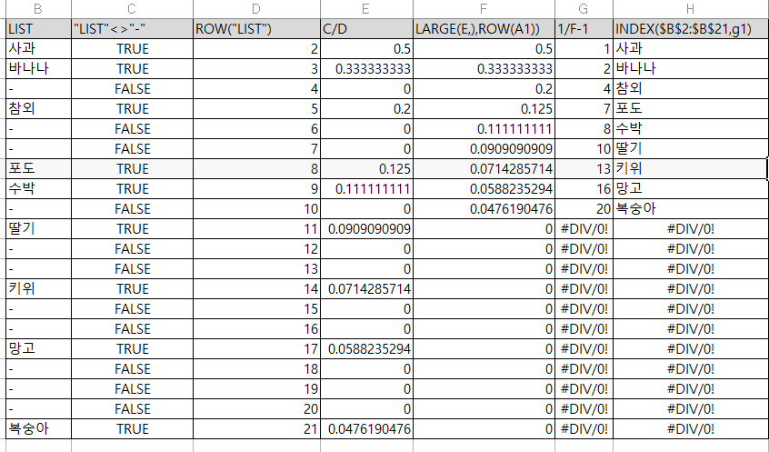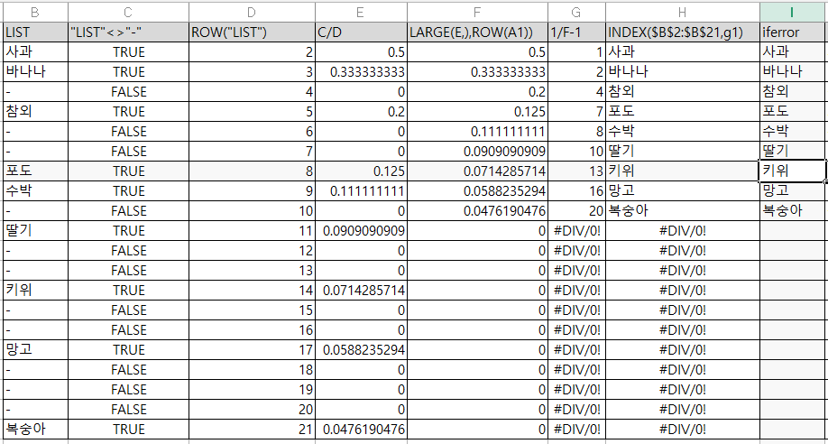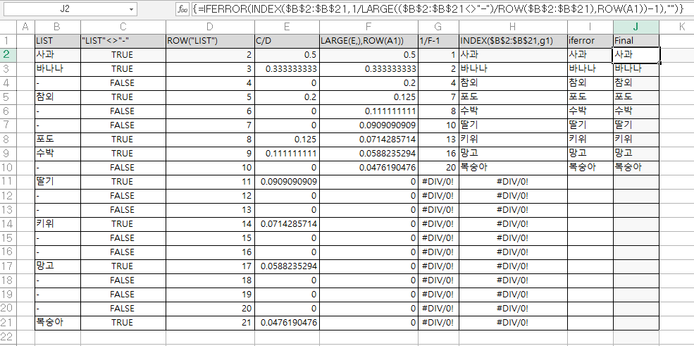 #DIV/0! 이게 보기 싫으니 제거해 주기로 합시다. "IFERROR" 함수를 이용하여 빈칸이 되도록 해줍니다. 최종적으로 원하는 대로 빈 셀들은 제거되고, 값이 있는 리스트로만 정리가 되었죠?
