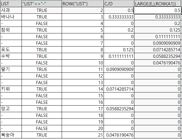 ROW 함수를 이용하여 행수를 구하고 이를 나눠줌으로써 위에서부터 큰 값을 갖게 임의의 값을 부여합니다. (FALSE는 0으로 나타나도록)