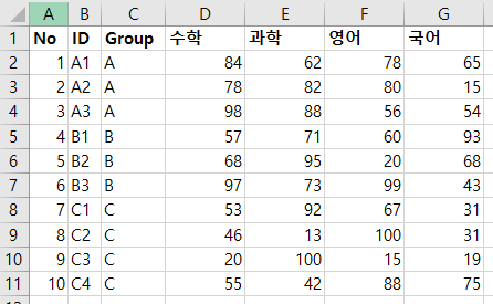 결과를 보니 잘 나왔습니다. 그다음 A1셀을 기준으로 각 그룹의 각 과목이 시작하는 셀로 이동시켜보려고 합니다.