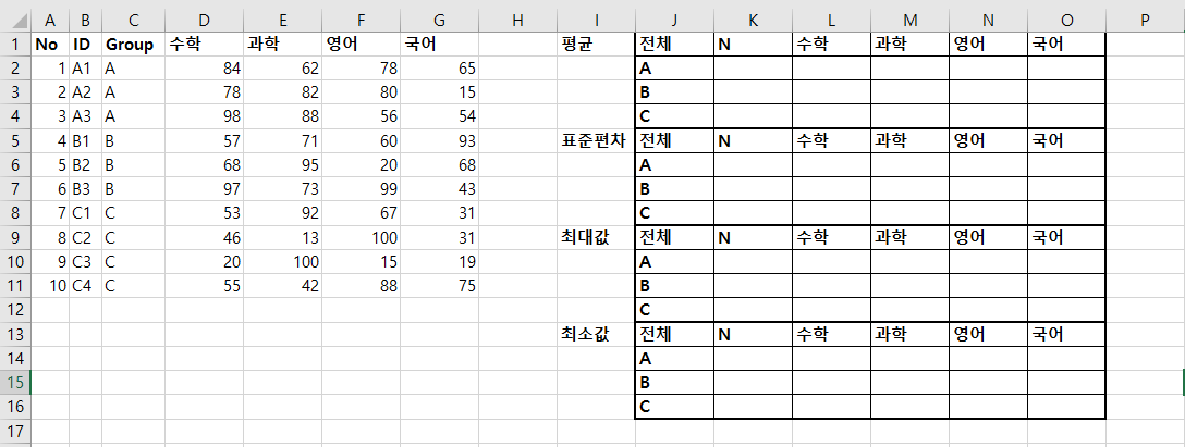 이번에는 평균, 표준편차, 최댓값, 최솟값을 한 번에 구하는 법을 소개하려고 합니다. 이것은 일반적으로 "AVERAGE", "STDEV.P", "MAX", "MIN"을 쓰면 된다고 생각하실 수 있는데, 해당 함수를 막상 쓰기에 어려울 때가 있습니다. 그리고 한 번에 구하기가 어려울 때가 있습니다. 그룹별로 포함된 수가 다르고 많은 경우 평균, 표준편차, 최댓값, 최솟값 등을 한 번에 구한다는 것은 쉽지 않습니다. 예를 들어 아래와 같은 상황입니다.