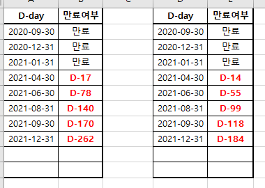 [Excel] D-day를 구해보자!! D-day를 엑셀로 구하는 방법을 소개하려고 합니다. D-day 어플도 많이 나와있지만, 엑셀로 직접 계산해 보는 것도 재미있지 않을까 싶습니다. 1. D-day 날짜 확인 아래 그림은 제가 임의적으로 D-day 날짜를 지정해 보았습니다. 2. 일반적인 D-day 우선 D-day 표시를 하기 위해 정해 놓은 D-day에서 오늘 날짜를 빼보도록 하겠습니다. 뺀 다음 D-day 가 지났다면 "만료"라고 표시하고, 안 지났다면 "D-" 글씨를 추가하여 D-xxx 이런 식으로 나타내고자 합니다. 오늘 날짜를 위해 TODAY() 함수를 사용했습니다 (2021.04.13 기준). 그리고 IF 함수를 이용하여 지났는지 아닌지를 판단하여 나타냈습니다. =IF(A3-TODAY()